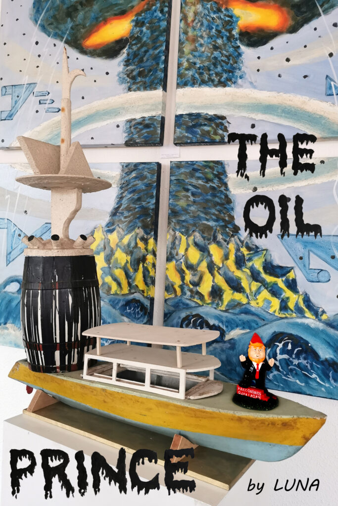 Mein Ready Made: „The Oil Prince“, Holz, Kork, Metall, Spielzeugfigur, Höhe 116 cm, Breite 25 cm, Länge 104 cm wird im Schaufenster der Buchhandlung BÜCHERWURM in der Zollstraße 7, 21465 Wentorf ab Freitag, den 29.05.26 Für die Dauer der Wentorfer Kulturwoche ausgestellt werden. Diese künstlerische Arbeit von mir thematisiert die verhängnisvolle Kombination von Infantilität und grenzenloser Macht.